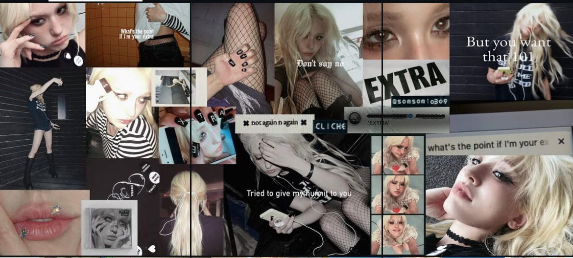 asthetic :// noir bohemian. pele marcada. colares embolados. lingerie à mostra. skinz. fotos rasgadas. meias rasgadas. olhos marcados. tumblr grunge. olhar blasé. coturnos surrados. espelhos quebrados. glam rock. cabelo platinado. hobbies :// aprender coreografias com suas amigas quando está bêbada. fazer maquiagens em vitimas não voluntarias. fotografar momentos importantes. caminhar sozinha por paris. escrever em diarios quase destruidos.